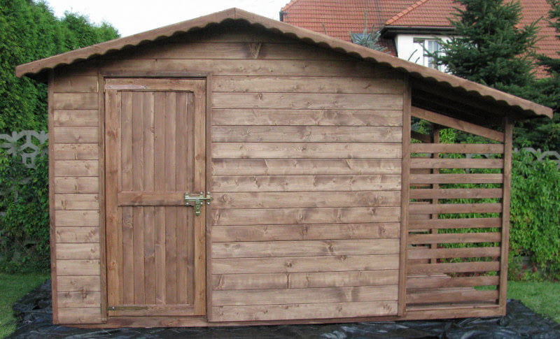 Domek narzędziowy 3 x 2m, podwójne drzwi + drewutnia 1,1 x 2m z dachem prostym dwuspadowym na boki