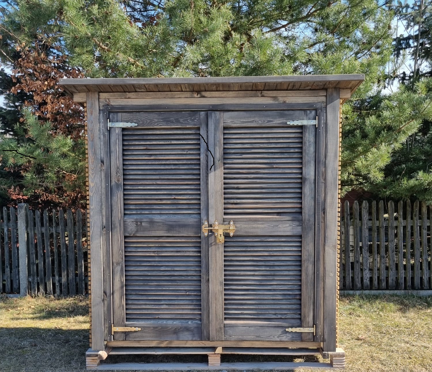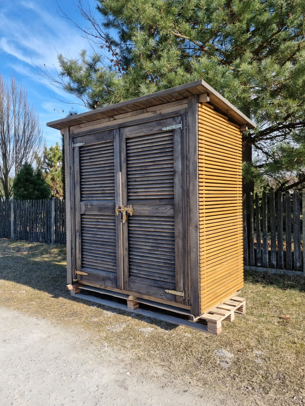 Domek narzędziowy 2 x 1,1m w konstrukcji słupowej z dachem prostym jednospadowym (do przodu lub do tyłu) – podwójne drzwi żaluzjowe