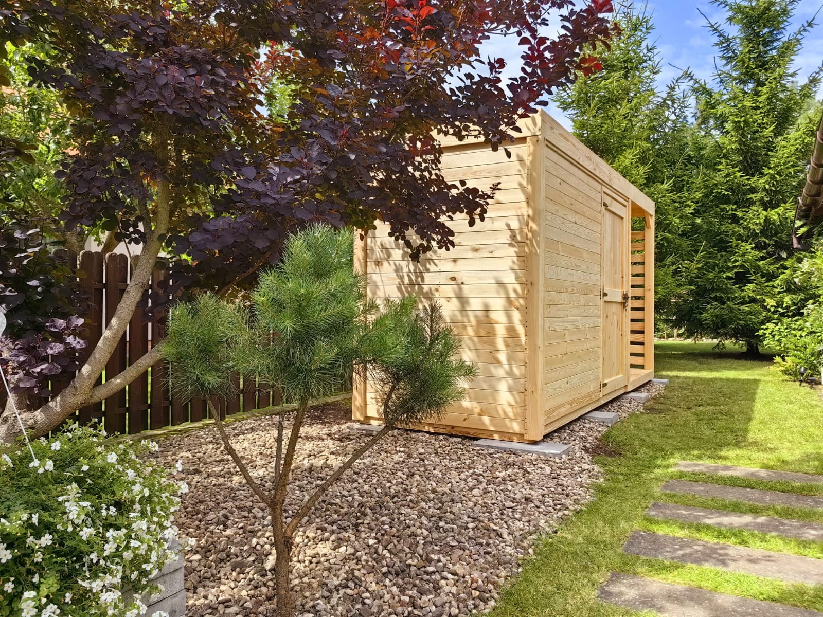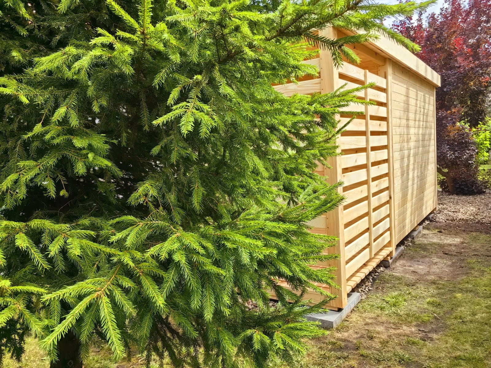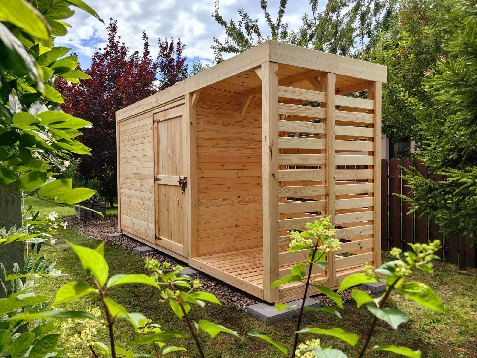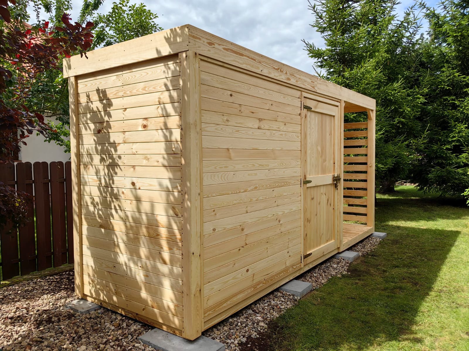 6. Domek narzędziowy 3 x 1,5m + drewutnia 1,5 x 1,5m z dachem prostym jednospadowym w obrysie ścian (do tyłu)