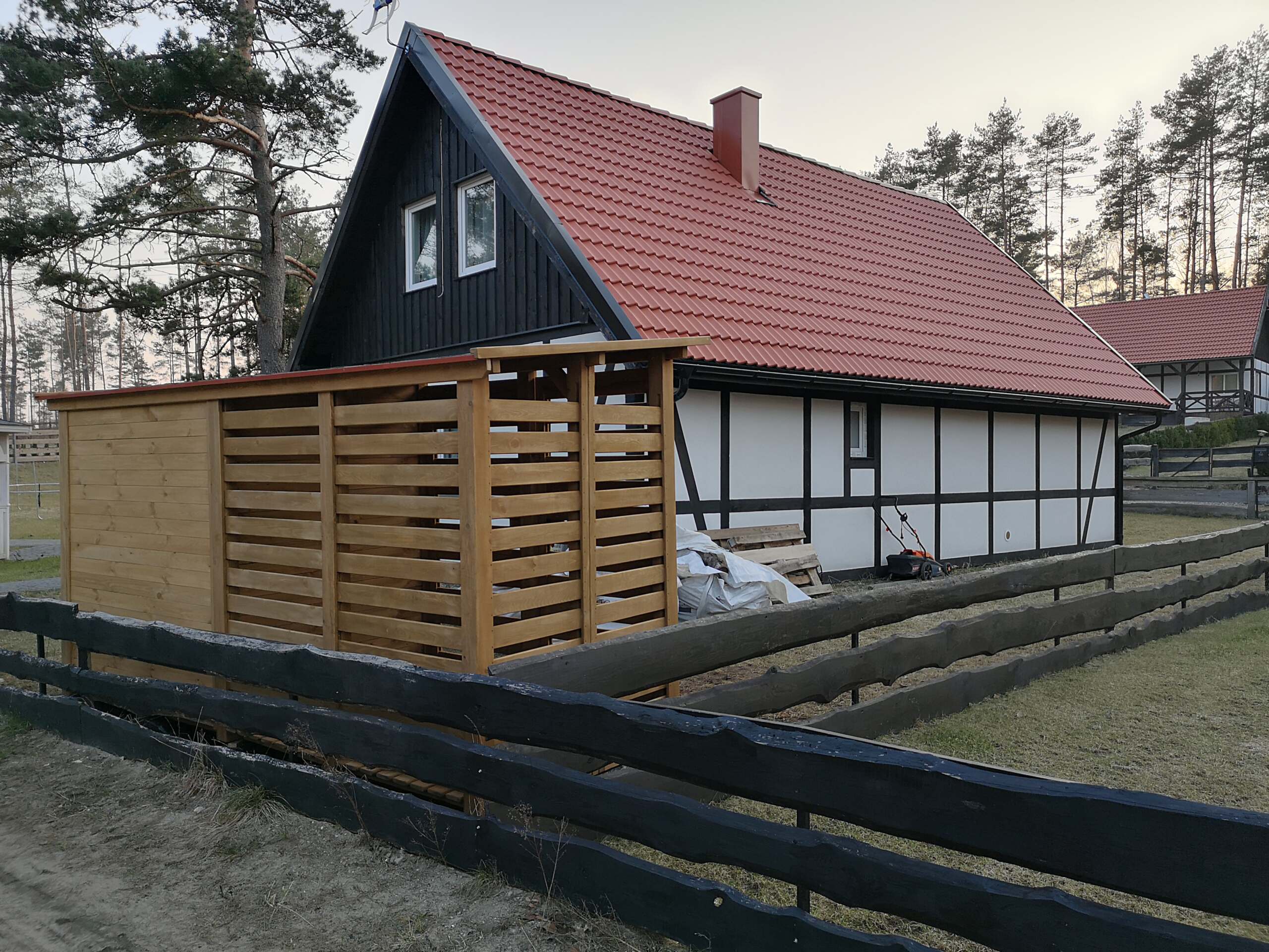 Produkt wykonany jest z drewna sosnowego o wilgotności powietrzno – suchej. Jest ona odpowiednia do użytkowania zabudowy na zewnątrz, bezpośrednio wystawionej na działanie warunków atmosferycznych. Głównymi elementami konstrukcji są słupy o przekroju 10 x 10cm. Pozostałe elementy konstrukcji są o wymiarach 4,5 x 7 cm; 4,5 x 4,5cm. Deska profilowa o gr.22 mm; deska boazeryjna/elewacyjna o gr.15mm. Ze względu na nacisk jaki generuje zgromadzone drewno na ściany boczne, deskowanie drewutni jest mocowane w odpowiednich rowkach masywnych słupów. Całość zabudowy skręcana jest za pomocą specjalnych wkrętów, co zwiększa wytrzymałość i stabilność całej konstrukcji. Pokrycie dachu stanowi papa termozgrzewalna o gr. 4,2mm, która jest już zamontowana na dachu. Boki dachu są wykończone narożną listwą maskującą, natomiast część opadowa wody zabezpieczona przy użyciu obróbki blacharskiej.