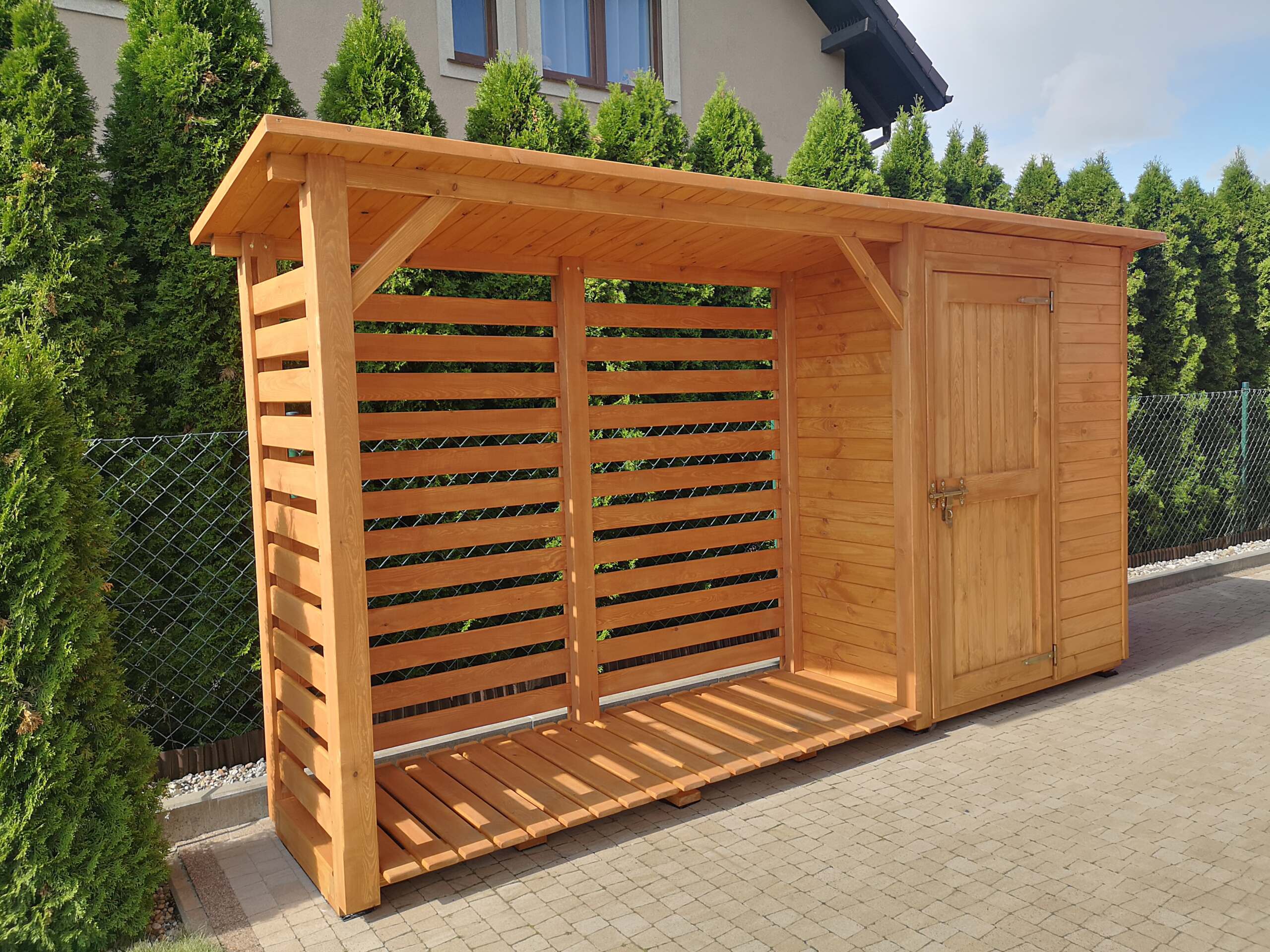 Drewutnia 2,5 x 0,8m + domek narzędziowy 1,5 x 0,8m (po prawej lub lewej stronie) z dachem prostym jednospadowym (do przodu lub do tyłu)