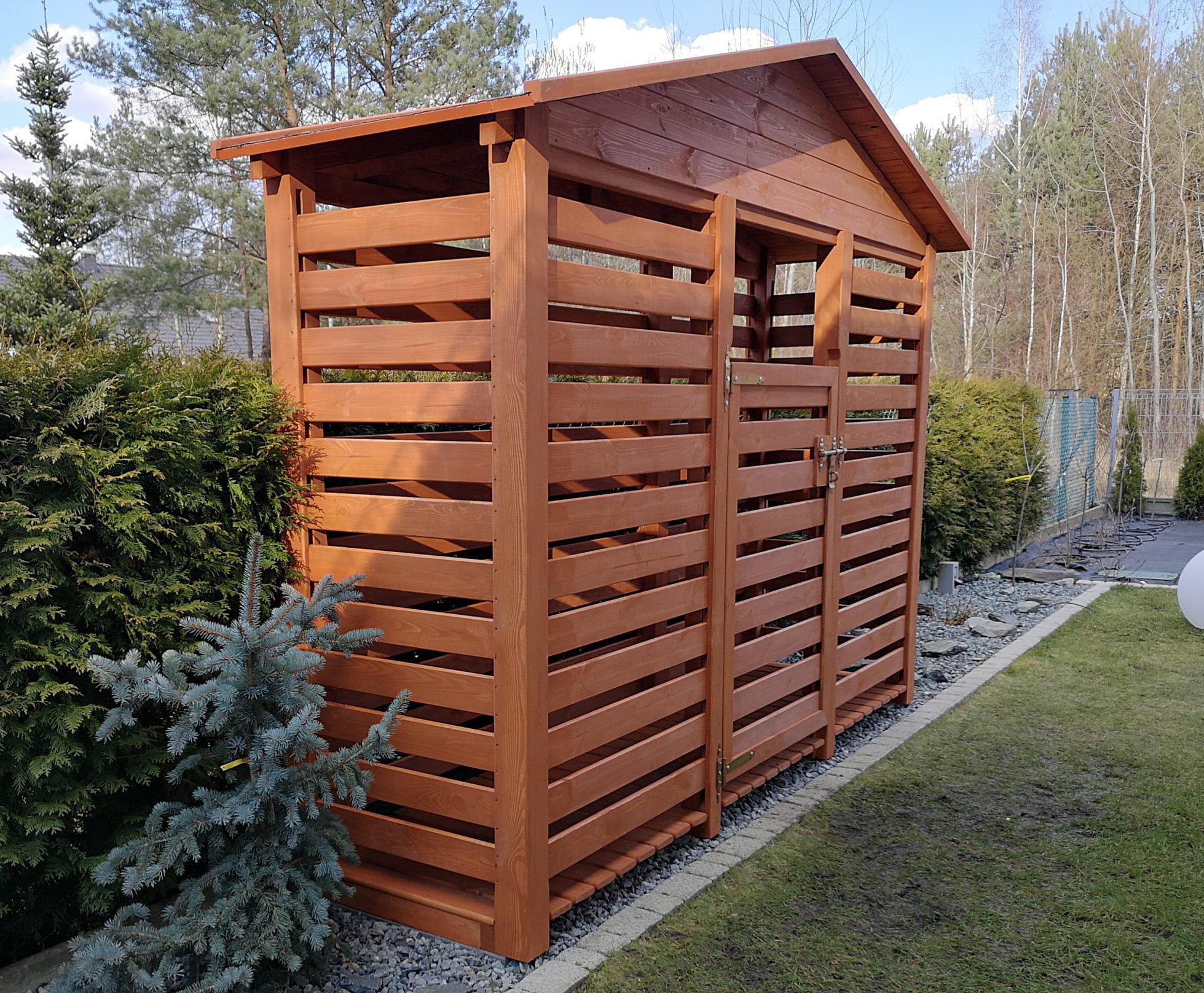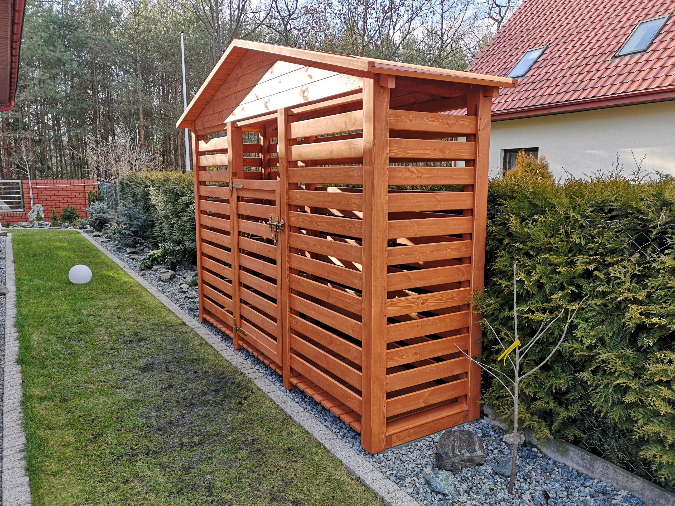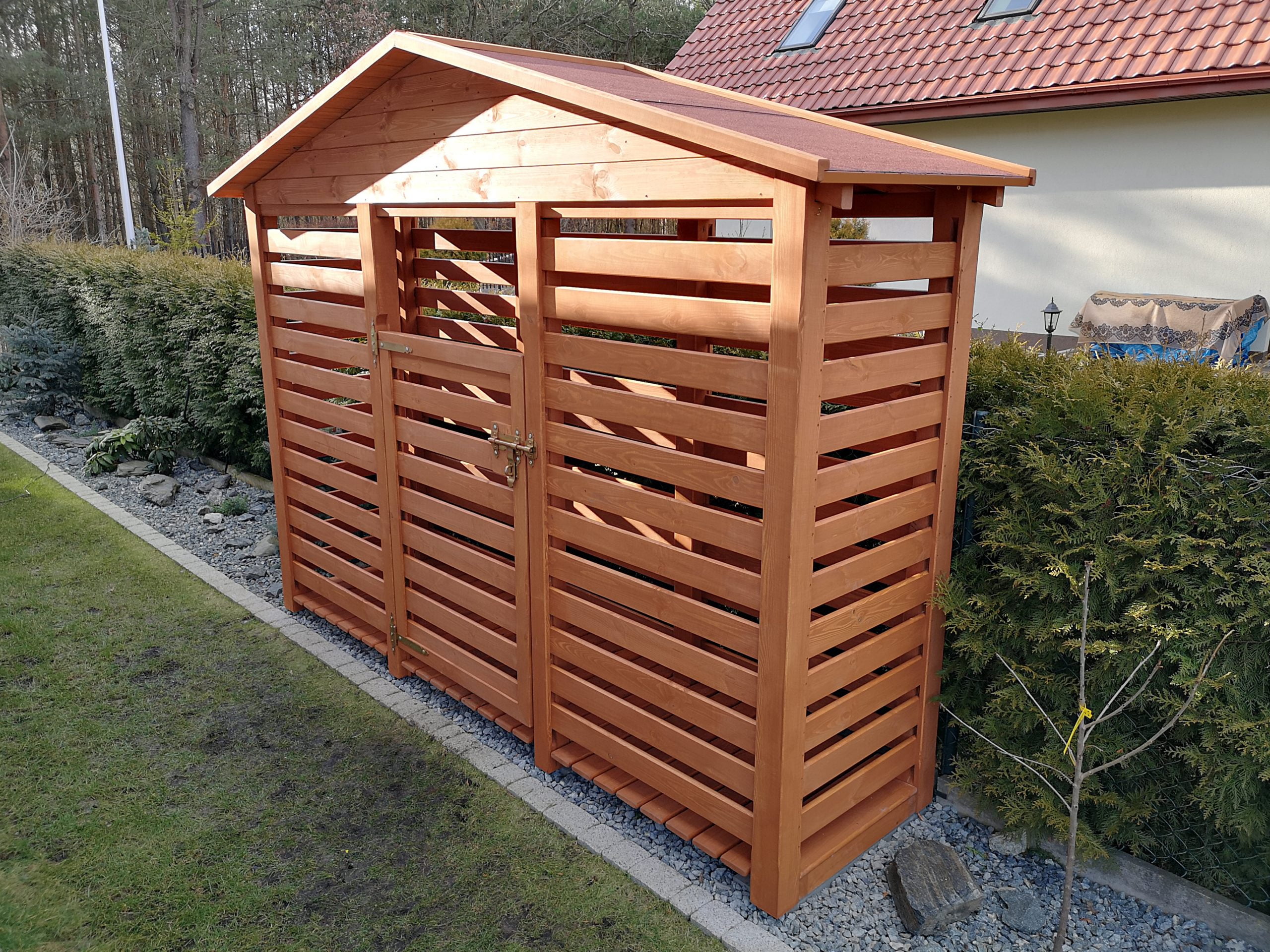 ewentualna nakładka ozdobna z cienkich listew na zewnętrzną boczną ściankę drewutni – 450zł/1szt (patrz PDF opcje dodatkowe na dole strony)