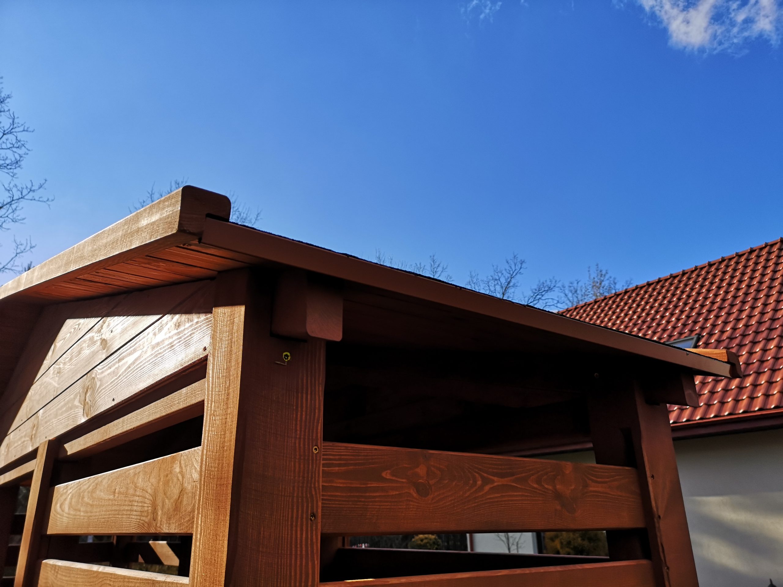 Produkt wykonany jest z drewna sosnowego o wilgotności powietrzno – suchej. Jest ona odpowiednia do użytkowania zabudowy na zewnątrz, bezpośrednio wystawionej na działanie warunków atmosferycznych. Głównymi elementami konstrukcji są słupy o przekroju 10 x 10cm. Pozostałe elementy konstrukcji są o wymiarach 4,5 x 7 cm; 4,5 x 4,5cm. Deska profilowa o gr.22 mm; deska boazeryjna/elewacyjna o gr.15mm. Ze względu na nacisk jaki generuje zgromadzone drewno na ściany boczne, deskowanie drewutni jest mocowane w odpowiednich rowkach masywnych słupów. Całość zabudowy skręcana jest za pomocą specjalnych wkrętów, co zwiększa wytrzymałość i stabilność całej konstrukcji. Pokrycie dachu stanowi papa termozgrzewalna o gr. 4,2mm, która jest już zamontowana na dachu. Boki dachu są wykończone narożną listwą maskującą, natomiast część opadowa wody zabezpieczona przy użyciu obróbki blacharskiej.